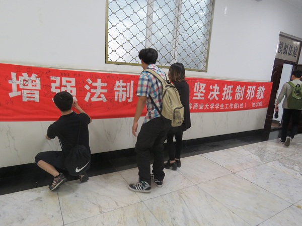 法学院学生在“增强法制意识,坚决抵制邪教”条幅上签名