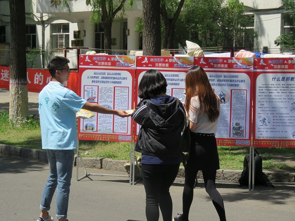 摆展台期间,向全校学生发放反邪教宣传单