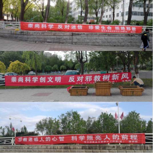 反邪教宣传教育任务是一个长期的且持续性的工作。因此,为了增强宣传的效果,提升宣传影响力,法学院在西门、主楼附近悬挂“增强法制意识,坚决抵制邪教”条幅,并在B区1、2公寓播放抵制邪教视频,通过潜移默化的方式,增强同学们对邪教危害的认识,更有效地抵制邪教。