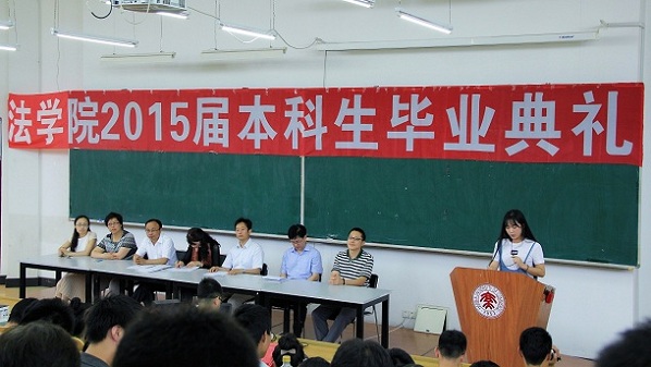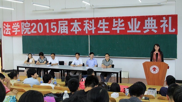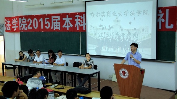 2015年6月16日下午,法学院2015届本科毕业生毕业典礼在4211教室隆重举行。法学院院长石晶玉教授、法学院副院长徐铁岩副教授、法学院党委书记赵国军副教授、法学院党委副书记高勇副教授、法学院团委书记李萍老师、毕业生导员钱思彤老师,教师代表吴元国老师、张伟东老师、朱凤义老师以及毕业生和在校生出席了典礼。