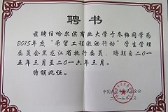 社会工作专业于冬梅同学因其在2014年中国青少年发展基金会的“激励行动”中的优秀表现,获得中国青基会的荣获2014希望工程激励行动公益项目领袖奖并被聘请为2015年“激励行动”学生管理委员会黑龙江省执行委员。