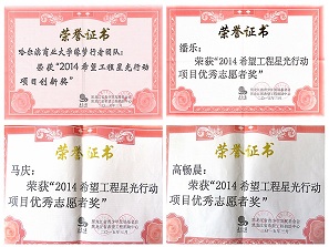 同时获得2项黑龙江省青基会星光行动项目资助,分别是“瘾”你出网网络引导项目和伴你同行—关爱脑瘫儿童。今年共有50份项目申请书及实施方案在创新性、自主性、执行性、示范性、最优性中脱颖而出,获得2015年度“希望工程鑫达星光行动”项目资金支持,其项目团队获得项目实施权。获得项目实施权的团队根据申请项目模式可获得3000—10000元的项目资金,并将在项目实施期获得公益专业化培训和导师陪伴。我校总共获得7项。