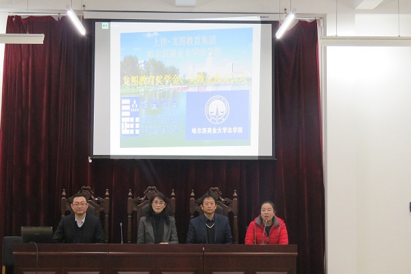 12月30日下午4:30分,哈尔滨商业大学法学院龙图教育奖学金、奖教金颁奖仪式在教学主楼模拟法庭隆重举行。上律龙图教育集团法律职业人生规划首席讲师邓金华、大客户中心部分地区运营总监王熙彭、营销中心咨询经理李婷婷专程从北京赶赴哈尔滨商业大学参加颁奖仪式,法学院院长石晶玉教授、副书记高勇出席,法学专任教师代表、法学专业2013级、2014级、2012级同学代表参会,共同见证了颁奖盛况。