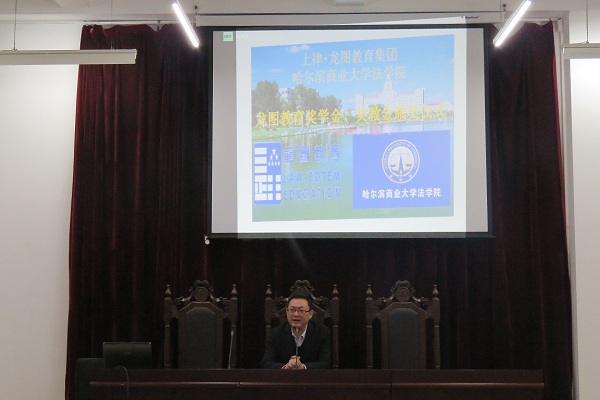 颁奖仪式由法学院副书记高勇主持。颁奖仪式开始前,主持人首先介绍了上律龙图教育集团概况。上律龙图教育集团是一家专门致力于传播法律思想、为社会输送高素质法律人才的教育企业集团。信仰法律、崇尚教育、追求真理、共享美好未来,一直是上律龙图教育集团的崇高愿景。为了鼓励法律学子刻苦学习、奋发向上,积极努力实现成为合格的法律人,追求、实现法律职业梦想的愿望,上律龙图教育集团在哈尔滨商业大学法学院设立奖教学金貮万元,专门为法学本科学生设立了“龙图教育奖学金”;同时,为鼓励广大教师积极投身法学、法律实践教学,更好地培养学生的综合实践能力,专门为法学专业教师设立了“龙图教育奖教金”。