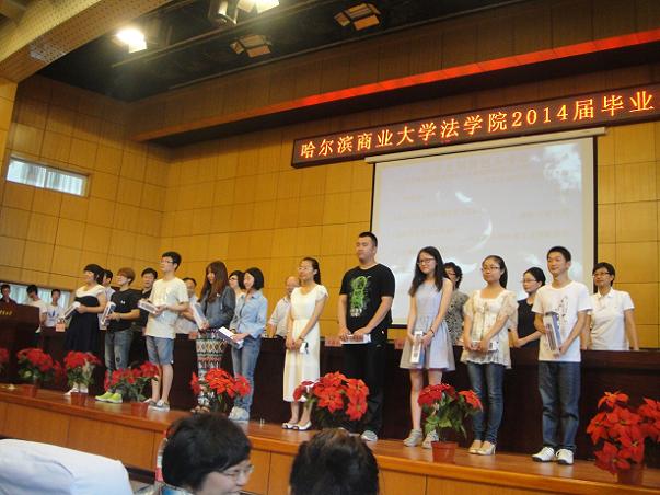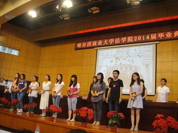 大会首先由党总支书记赵国军宣读毕业生获奖情况,为36名考取研究生、11名通过司法考试学生和荣获省三好学生、校级优秀毕业生颁发了证书和奖励。本届考研同学成绩优异,不乏收到中国人民大学、中国政法大学、中国青年政治学院等高等学府的入学通知。大会还隆重表彰了学院评选的优秀毕业生标兵,其中有以612分通过英语四级,591分通过英语六级,423分通过司法考试、考取中国政法大学的孙银霞同学作为当之无愧的榜样人物收获国家奖学金,省三好学生、校优秀毕业生等多项名誉,成为到场每位同学的楷模。还有带领法学院女篮取得三连冠的肖爽;获得一等奖学金、优秀大学生、勤奋学习标兵、英语演讲大赛一等奖和校优秀毕业生,考取南京大学研究生的孙茜;获得“双十佳大学生”、“优秀学生会干部”的学生干部代表马赫;获得第十三届挑战杯全国大学生课外作品竞赛交叉创新一等奖成员谢玉;四年国际商法专业第一名并考取了中国海洋大学研究生居冬梅;勇于实践参加星光行动的优秀社工人代表徐可心、杨振南;法律援助工作的代表杨桉;社会实践的代表,校年度人物李录杰等。