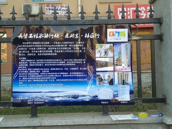 2014年4月希望工程激励行动正式启动,团队用一个月时间与老师探讨、深入到社区调查,最终确立项目,完成申报。2014年5月经过层层筛选,该项目从1400余份项目书中脱颖而出,成为预资助项目,6月与全国各大高校的大学生公益团队共赴北京,参加由中国青少年发展基金会主办、恩派社会创业家学院承办的项目指导与培训。7月通过三周时间对项目书进一步完善,该项目成功获得中国青少年发展基金会的资助。8月在哈尔滨商业大学、哈尔滨工业大学、黑龙江大学、东北林业大学、哈尔滨理工大学、黑龙江工程学院等各大院校进行项目宣传及租房意愿调查,以微博、微信、传单、条幅、展台等形式进行宣传,拓宽毕业生市场。以多样的形式进行宣传可以大范围的挖掘毕业生并提高网站知名度及点击率,有效地发展客户资源。通过初步的筛选,发掘更为合适的毕业生资源,也在一定的程度上减小了老人人身财产安全等方面的风险,同时也避免了后期搭建平台过程中可能出现的不必要的麻烦。10月深入多个社区寻找空巢家庭,进行房源信息收录。与社区工作人员协商,建立社区工作站,并与辖区派出所取得联系,经过筛选,与糖厂社区达成协议,最终确定糖厂社区为项目示范社区。创建项目网站,作为信息交流平台,开通微博、人人,申请微信公众号以便宣传及项目跟进。11月,志愿者作为中间人为双方搭建平台,具体相关事宜由在志愿者协助下,双方自行协商。双方自行协商可准确快速提供双方想法及相应要求,可有效避免双方日后共同生活中不必要的麻烦。