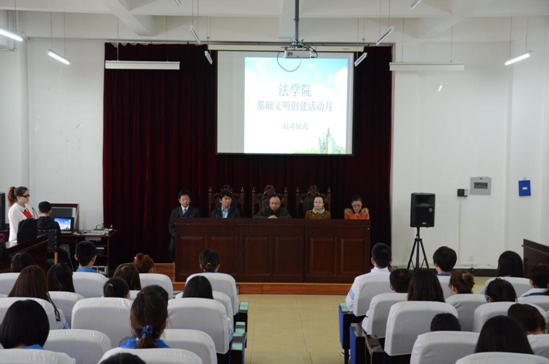 为引领学生积极培育和践行社会主义核心价值观,法学院积极响应校团委提出的“爱学习、爱劳动、爱祖国”为主题的建设校园文明的号召,3月25日在模拟法庭召开了基础文明创建月启动仪式。仪式由法学院党总支副书记高勇主持,出席仪式的有校团委副书记王鹤腾、法学院党委书记赵国军、法学院团委书记李萍、法学院团委副书记钱思彤以及法学院学生干部代表。