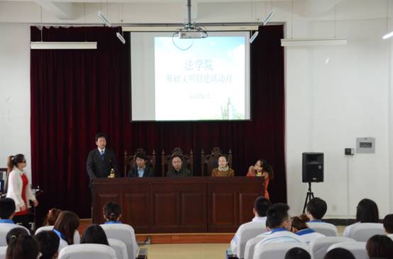 为引领学生积极培育和践行社会主义核心价值观,法学院积极响应校团委提出的“爱学习、爱劳动、爱祖国”为主题的建设校园文明的号召,2014年3月25日在模拟法庭召开了基础文明创建月启动仪式。仪式由法学院党总支副书记高勇主持,出席仪式的有校团委副书记王鹤腾、法学院党委书记赵国军、法学院团委书记李萍、法学院团委副书记钱思彤以及法学院学生干部代表。