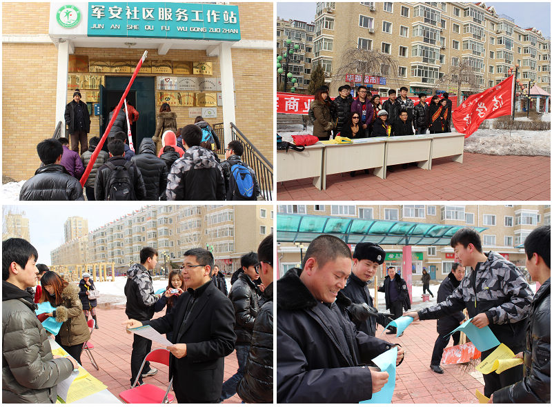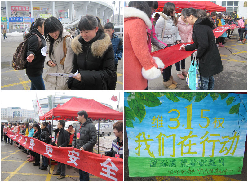 为深入开展“学雷锋”活动,在“3.15”消费者权益保护日当天,上午商大法律援助中心在校内举行了有关保护消费者权益的普法宣传,下午法学院学生会与商大法律援助中心在应用法教研室主任张春玲老师带领下走进松北区军安小区。开展了以“学雷锋,进社区,关注3.15”为主题的普法宣传活动。在活动现场,法学院同学安置了法律知识展板并发放了传单,以便社区的居民对本次活动和消费者权益维护有更好的了解,同时同学们耐心地为居民们讲解并分析了日常生活中常遇到的侵权问题以及解决的方法和途径。现场气氛非常活跃,同学们热情宣传,居民们积极参与。军安小区委员会主任对本次活动大力支持,并建议我院今后开展更多类似有意义的活动,加强学校与社区的联系。活动最后,现场还举行了热烈的全体签名仪式。
