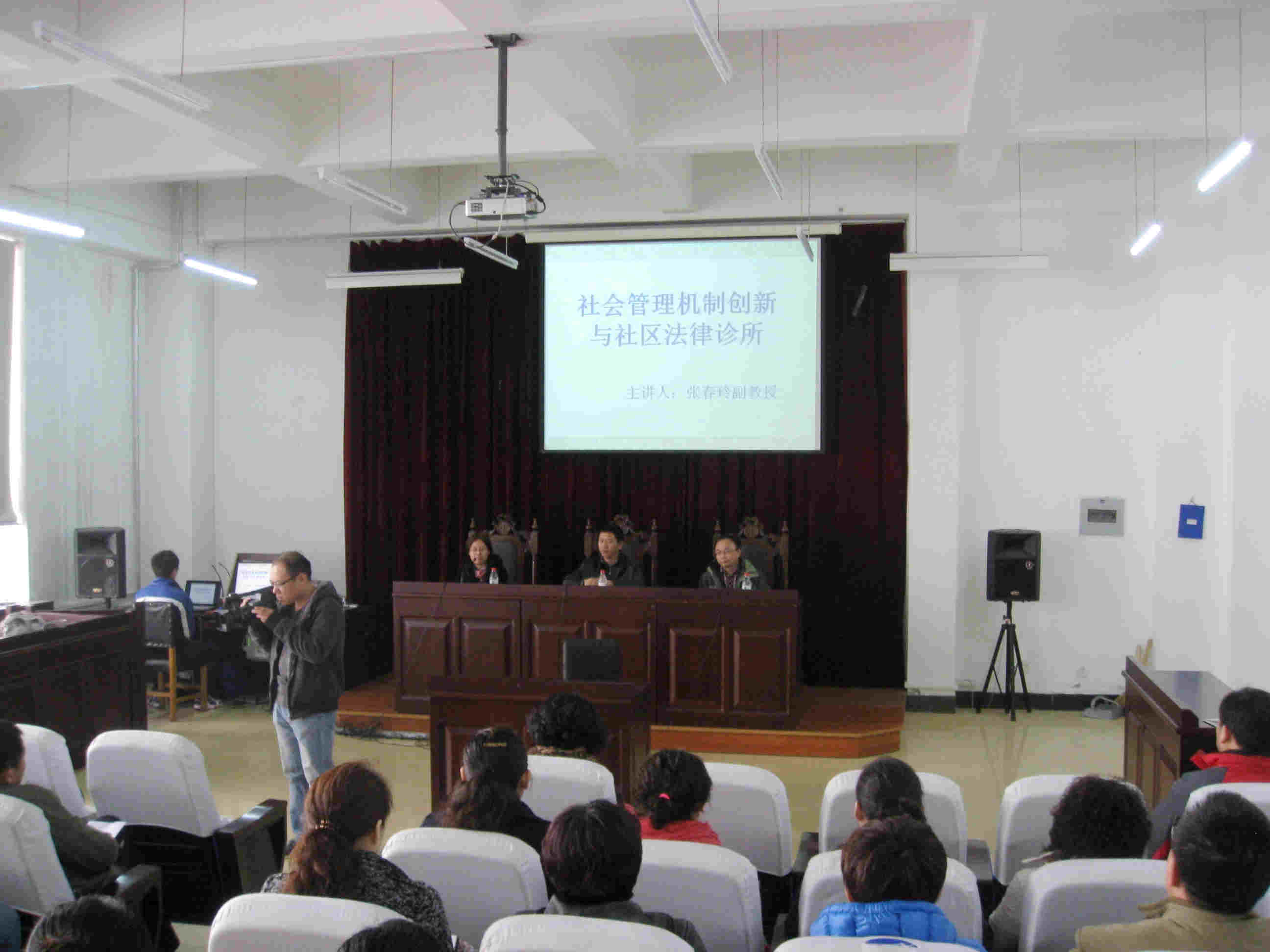 专题讲座上,法学院赵国军书记首先代表学院致欢迎词,道里区委政法委常务副书记杨金清对法学院一直以来支持地方,服务社会的系列活动表示感谢。哈尔滨市法学会会员部主任杨帆与哈尔滨道里区法学会秘书长刘沙一起带领各街道办事处领导及中心社区干部专注倾听讲座并认真做着笔记。主讲人法学院张春玲副教授以社会管理机制创新为切入点,阐述“创新”背景需求与效应,介绍“法律诊所”发展脉络以及颇具哈尔滨模式效应的“社区法律诊所”。沿“物权”与“债权”两大脉络,展开社区工作生发点:人与物的关系定位;人与人的矛盾化解。重点强调社区工作就是“人”的工作,人的冲突大多因“债”缘起,侵权与违约是厘清人际人脉纠纷的重要路径,未来大社区理念下社区矛盾焦点如征地拆迁、动迁补助、农民工维权、物业、保险、治安、养老等系列问题都需要从法律上给予对接解答。“社区法律诊所”承载了政府、高校、社会三方资源共同面向百姓大众,依法行权,联合服务,既提升了社区业务品质,更对社会维稳发挥重大平衡作用。“社区法律诊所”不仅创新了社会管理传统机制,实践证明,从社会末梢切入,从排忧解难入手,对群众实行面对面的联合服务,也是地方高校参与社会管理创新的有效形式。