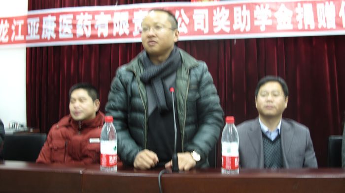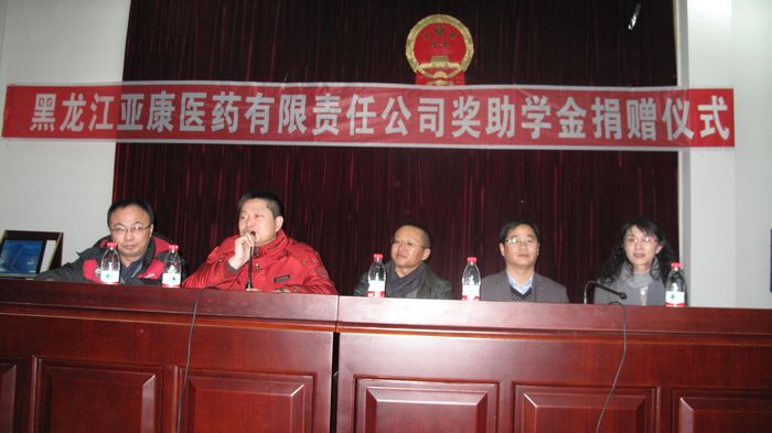 参加此次捐赠仪式的嘉宾有黑龙江亚康医药有限责任公司董事长李正鸿先生及亚康医药公司的领导、校学生工作处处长冉庆国、研究生学院院长王福友、会计学院党总支副书记赵世杰、法学院负责人石晶玉、法学院党总支副书记赵国军,会议由赵国军副书记主持。