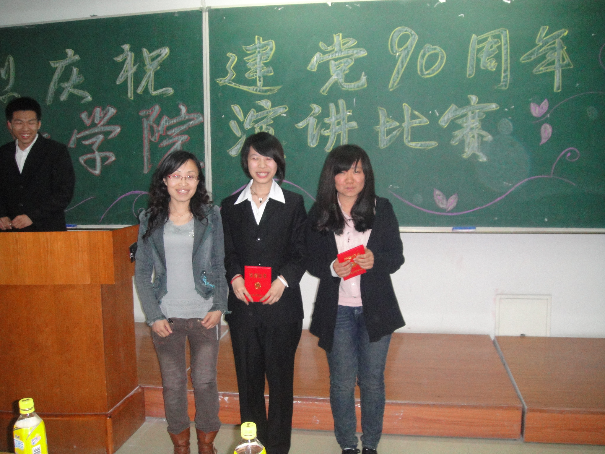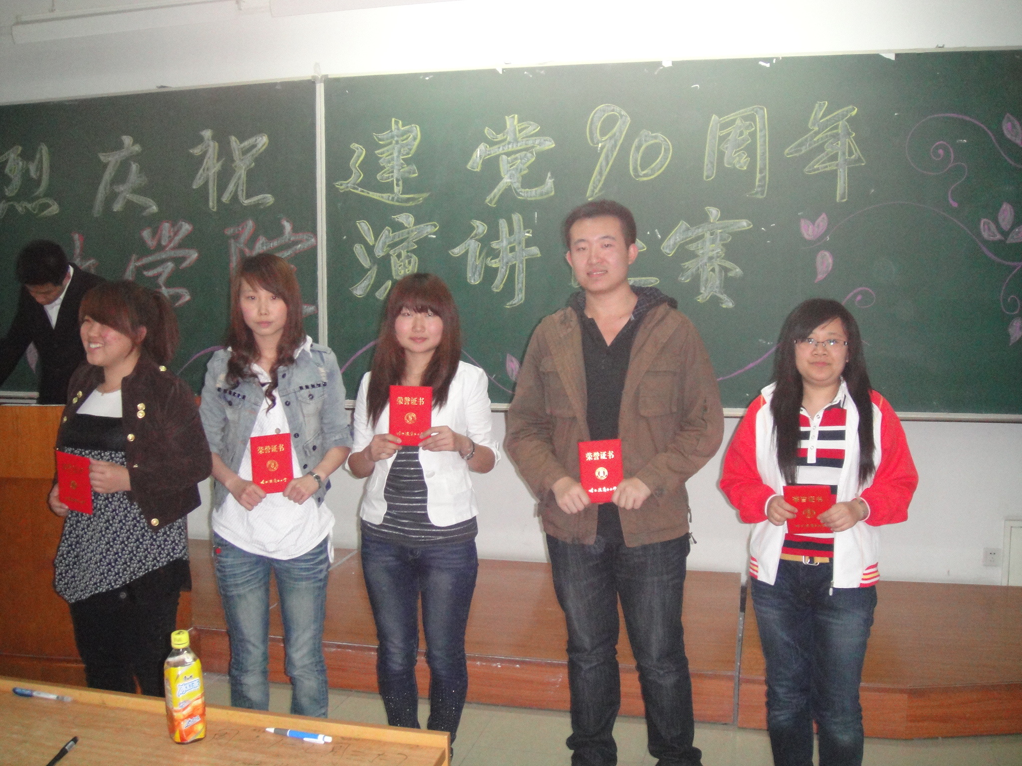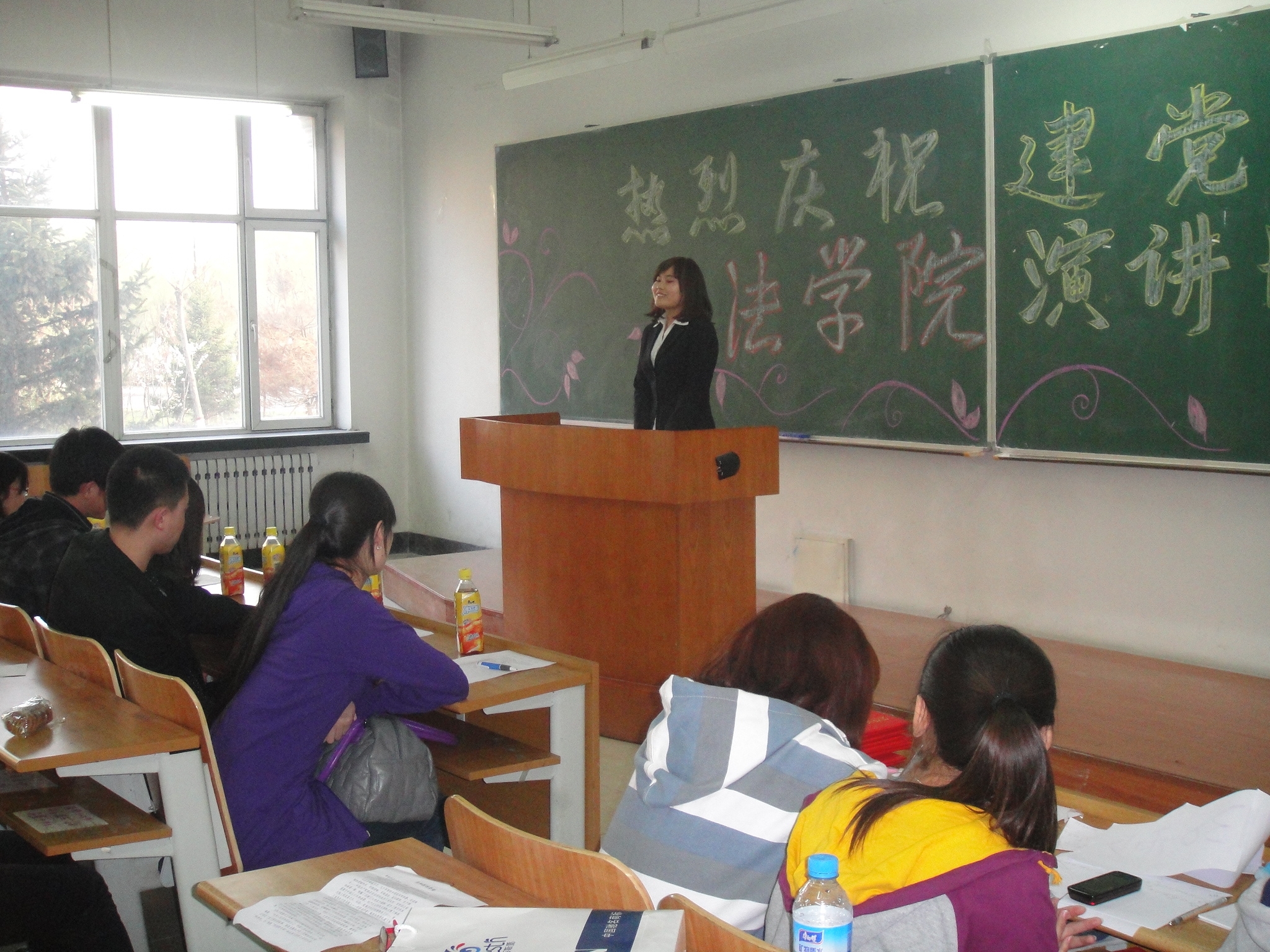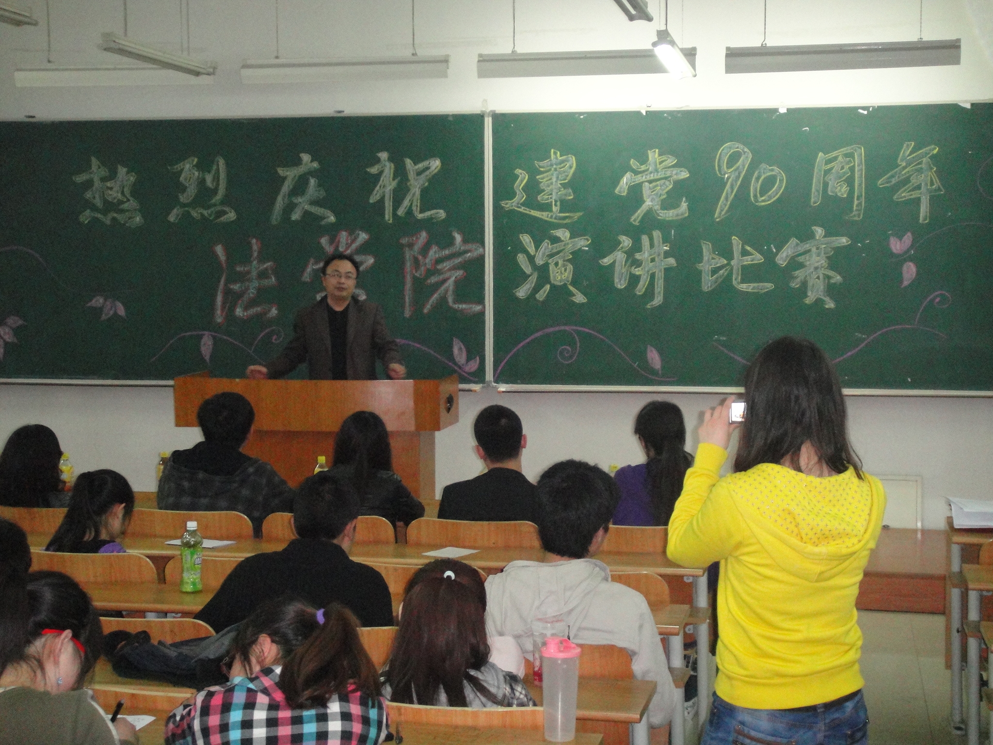 为纪念建党90周年,法学院于2011年5月9日17时在3106教室成功举办了以“党在我心中”为主题的演讲比赛。院党总支副书记赵国军、辅导员李萍及07、08级学生代表担任评委,法学院200多名学生观看了此次比赛。