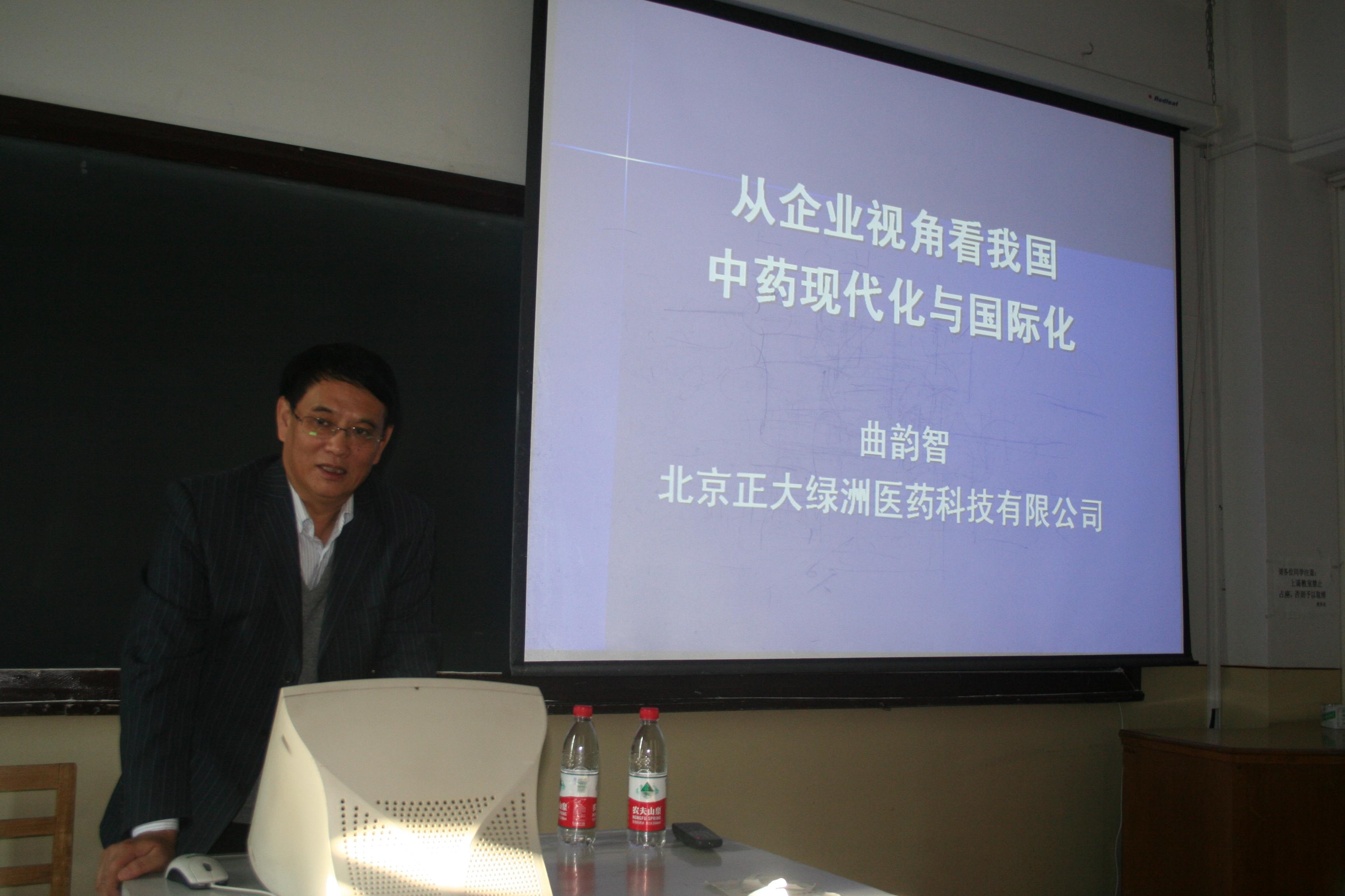 曲韵智教授是学术型的企业家,在内蒙古医科大学从教二十多年后,与正大集团合作,在北京创办了正大绿洲医药科技有限公司,主要从事新药的研发,目前已经开发出新药100多种,发明专利200余项。2007年曲韵智教授被聘为哈商大药学院药剂学硕士导师,5年来为药学院培养了10多名优秀的硕士研究生,此次来校,他结合自己企业的发展和研究经历,作了题为“从企业视角看我国中药现代化与国际化”的讲座。他指出中药现代化的含义是:将传统中药的优势、特色与现代科学技术相结合;中药现代化的目标是:开拓国际市场、构筑国家中药创新体系;中药现代化的终极效果是:弘扬中华民族优秀文化、振兴我国民族医药工业、保证中药产业的可持续发展、带动多学科的发展。但中药现代化也面临着巨大的问题和挑战,在高水准目标、工艺、安全性、药理作用、临床、药学、制剂、GAP等方面都不同程度地限制了中药走向现代化,而解决这些问题的有效途径是:必须从科学选择中药新药处方、病证选择、加强中药药效物质及其作用研究、中药新药临床试验等方面入手。最后曲教授指出:中药现代化需要一系列研究思路、方法和技术的创新,需要建立相关的方法学创新平台,高等院校应该成为实现中药现代化的主力军。