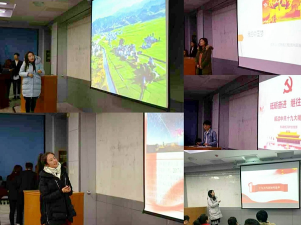 本次大赛分为初赛和复赛两个阶段。初赛以各学生党支部为单位进行,经过初赛选拔,共有9名表现优秀的学生党员脱颖而出进入复赛。复赛于11月24日在C区310教室举行,选手们分别围绕党章的建设历程、生态文明建设、建设社会主义文化强国、大力实施创新驱动发展战略、中国梦等多个方面结合自身理论实践,以事说理,深刻的阐述了学生党员己对十九大报告精神的理解和对党砥砺奋进的五年带给自己的感受。赛程中,台下的党员们都认真听讲、主动摘抄笔记,且对每位选手的讲述回报以热烈的掌声。
