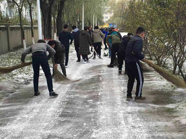 同学们以雪为令,分班分批进行,在班委的带领下拿着铁锹、除雪板和大扫帚积极奋力的清理着道路上的积雪,按照分工积极投入到积雪清扫之中。道路上都是他们忙碌的身影。大家拿起了扫把、铁铲相互协作。低温及凛冽的寒风让他们的脸和手冻得通红,但大家依然斗志昂扬,清理了校内主干道路等地的积雪。