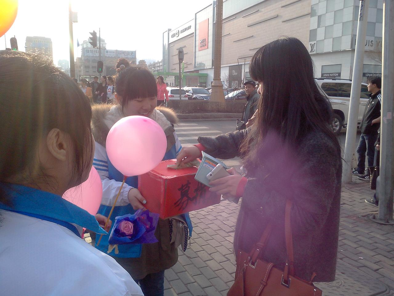 3月23日,质量管理工程1班同学分为8组,以中央大街新一百为集中地,在中央大街、秋林、防洪纪念塔等多个著名街景处开设展台。活动期间,同学们主要通过义演和义卖两种途径募集善款。一方面,同学们通过出售自制的小饰品募集资金;另一方面,同学们获得黑天鹅电器义务赞助的音响设备,进行义演来以此筹集善款。各小组经过一整天的辛勤募捐,为贫困山区儿童集得两千余元善款。此次活动得到了市民的广泛支持,吸引许多社会上的爱心人士参与到活动中来。