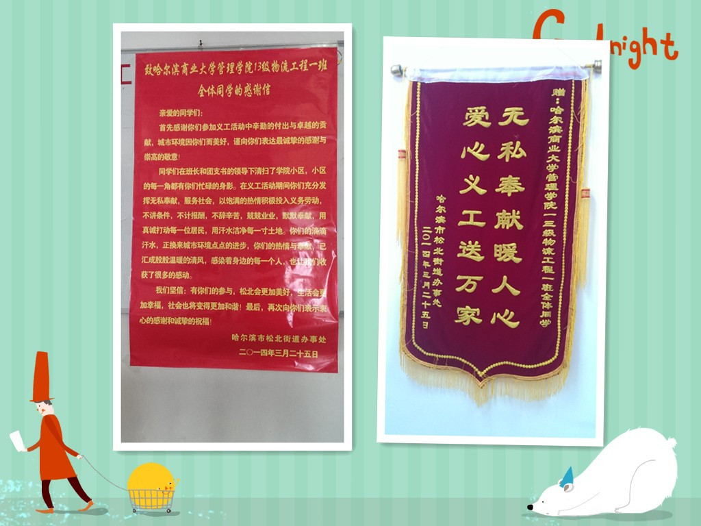 为了让大学生在公益事业中激发爱心与社会责任感,践行社会主义核心价值观。同时弘扬“爱学习、爱劳动、爱祖国”的精神品质,2014年3月24日,管理学院13级物流工程1班团支部带领本班同学到管理学院共建单位哈尔滨松北社区开展了义工活动。
