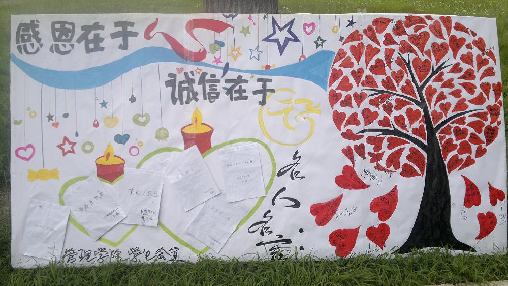 在为期半个月的感恩、诚信活动中,全院各基层班级及学生组织认真研习活动要求,利用形式多样的宣传手段,在全院范围内形成了良好的“感恩与诚信”风气。管理学院通过大胆创新的工作思路和工作方法,打造了一系列具有高质量的品牌“感恩、诚信”活动。