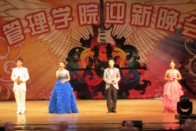 又是一年新腾飞,又是一年迎新时。2012年10月23日晚,管理学院迎新晚会在B区大礼堂隆重举行,在欢迎2012级同学加入了我院的同时,也给了新同学们一个充分展示自我、挑战自我、突破自我的宽大舞台。出席此次晚会的领导老师有校宣传部部长李德学,校学生工作部部长白云龙、校保卫处处长孙广文、校团委书记贾妮燕、管理学院院长白世贞、管理学院党总支书记安瑞娟、党总支副书记谭士元、副处级辅导员王中华、团委书记曹桂彬、各级辅导员张国利、李莹、孟庆吉等。此外,校级团学各大组织与兄弟学院学生组织负责人也应邀参加了本次晚会。