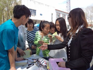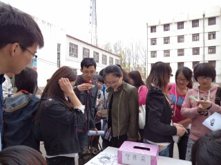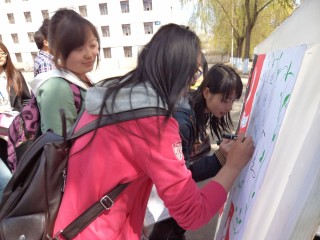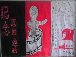 5月4日上午十时,团委自发组成志愿队伍在操场上向来来往往的同学们分发宣传海报,诠释“爱国、进步、民主、科学”的“五四”精神。为让同学们牢记五四历史及精神,志愿者们还组织同学们参加围绕着五四的历史及意义等设置的抽奖问答活动。连续答对三题的同学,不仅可以得到丰厚的礼品,还会得到“智慧之星”的称号,并在签名板上留下自己的名字。