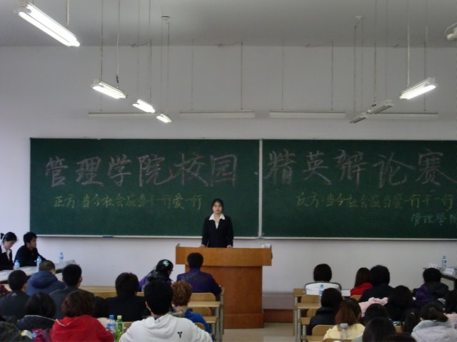 活动前期组织人员认真进行了挑选辩题、邀请评委等准备工作,并在初赛前对辩手进行了两次培训。随着复赛的开始,选手们对于辩题的理解都更进了一步,体现出了一个学习渐进的过程。决赛前期,工作人员精心制作了辩论赛纪实的照片集,并在大一新生中挑选了优秀的节目在比赛间期表演,将整场比赛推向了高潮。而在决赛中,各位辩手唇枪舌剑,你来我往,激烈异常,到场观众无不为之拍手叫好。