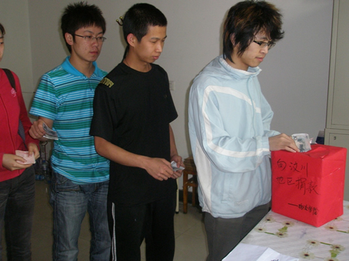 当物流学院师生获悉25月12日的汶川强烈地震夺走了成千上万名群众的生命,给灾区的同胞造成了巨大的创伤和痛苦,无数人们无家可归的,伤亡数字在不断攀升的消息,师生的心中都会涌起无限的哀思。他们在深切关注着灾区同胞的生命安全和生活保障的同时,按照学校党委的安排,于5月14日中午,发起了向汶川地震灾区捐款活动。