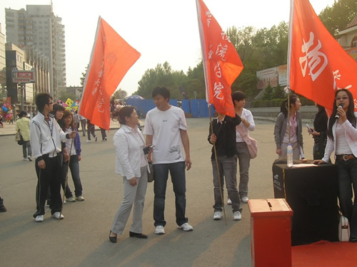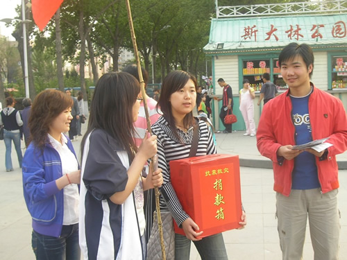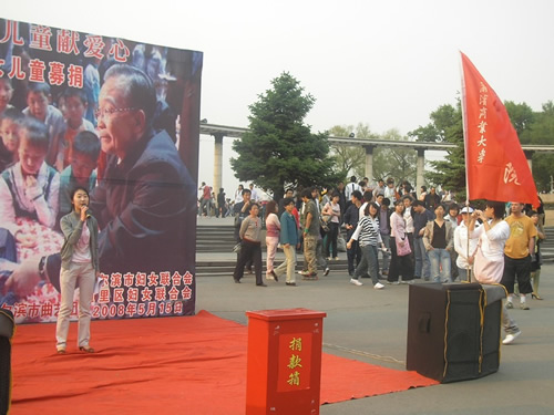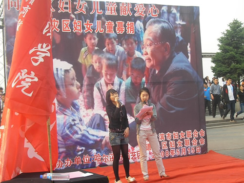 五月十七日下午四时,哈尔滨商业大学物流学院党团组织与哈尔滨市妇女联合会,道里区妇女联合会一起在哈尔滨市防洪纪念塔广场共同举办“为灾区妇女儿童献爱心”募捐赈灾活动。