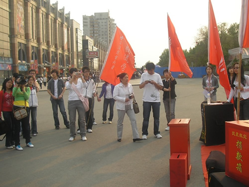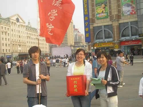 物流学院的党团员同学30余人,准备了捐款箱、歌曲磁带和旗帜以极大的热情投入到募捐赈灾工作中。学院团委学生负责人刘家旭、王冰,学生会主席邹明等分工负责宣讲、表演、捐款、发传单等工作。