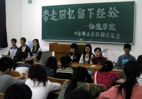 2008年5月21日,物流学院召集2008届毕业生中顺利就业、成功考取研究生、公务员及职业生涯设计效果好的同学,与在校生一起举行了主题为“带走回忆,留下经验”的就业经验交流会。