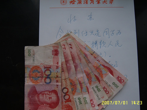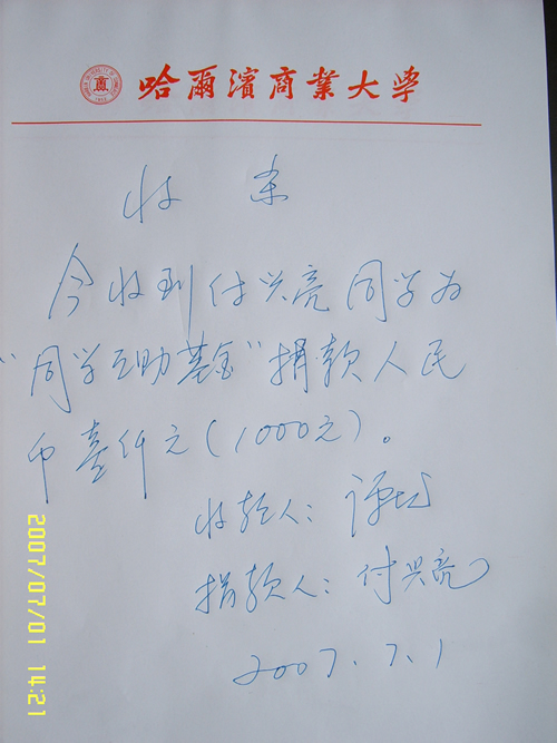 物流学院2003级付兴亮学同学,在即将离开母校之际,怀着对母校师生的感激之情,向物流学院“同学互助基金”捐款人民币,1000元,帮助在校贫困、特困学生。付兴亮同学在捐款时表示,“入学4年来,哈尔滨商业大学和物流学院教会了我做人、做事、做学问,使我从懵懂的青年成长为一名合格的大学生,在7月1日,这个光荣而神圣的日子里,作为一名中国共产党员,用这一行动表达对中国共产党和我的母校的感恩之情。希望祖国更加繁荣强盛,母校更加美丽和谐,师生更加幸福进步”。
