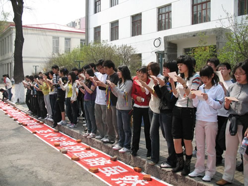 “用炎黄子孙的血性来签证中国的强壮,...我们万众一心,建设富强的国家,中国的明天更加辉煌,....”“支持北京,支持奥运,2008北京最棒….”。异口同声的宣传口号,不断从场地传来,强有力的《中国人》歌声久久荡漾在校园的上空....