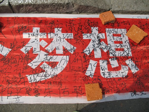 30多米长的红色条幅平铺在水泥路旁,上面印有“同一个世界,同一个梦想,和平奥运心系你我他,圣火传递的道路虽然崎岖,但是只有大家能团结一心,定能达到胜利的彼岸”宣传口号。络绎不绝的人群中,有大学生、教师、工人、家属和居民都纷纷在条幅上签名,祝福奥运,祝福中国。