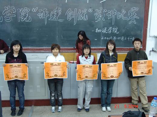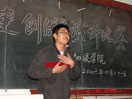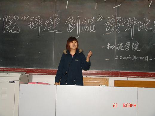 2006年4月21日下午4点30分物流学院在综合楼多功能厅举办了以评优创建为主题的演讲比赛,物流学院谭书记、张老师、王老师及全体大一同学参加了此次比赛。参赛选手是由各班级选送的优秀代表,参加演讲比赛的选手结合自身、学校以及评优创建的工作展开了激情洋溢的演讲。