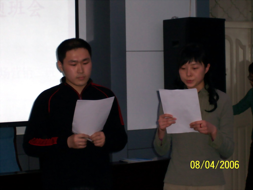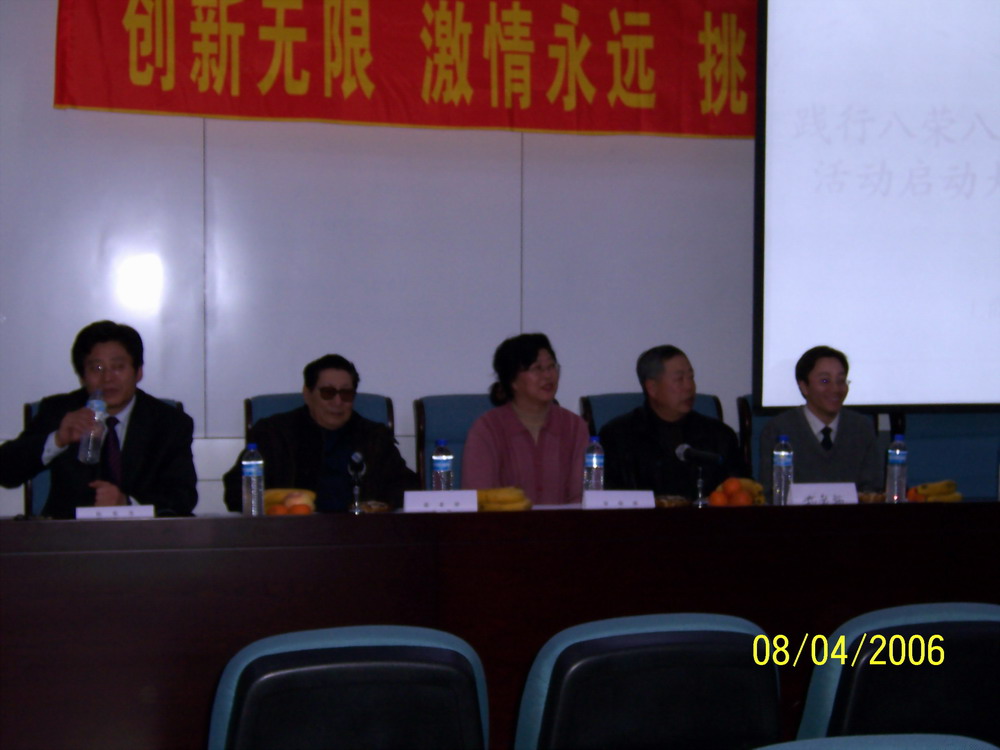 4月8日下午2点,工商管理学院2004级市场营销二班在西区主楼310教研室开展了以学习胡锦涛总书记所提出的“八荣八耻”为主题的班会。督导武老师和梁老师,工商管理学院党支部书记安瑞娟和院长孙东升,参加了此次班会。会议由班长朱鹏飞,团支书殷悦主持。