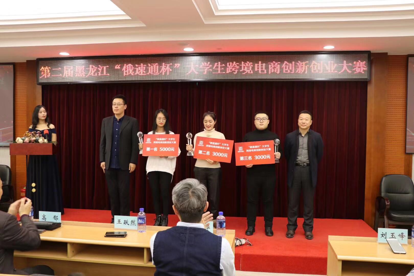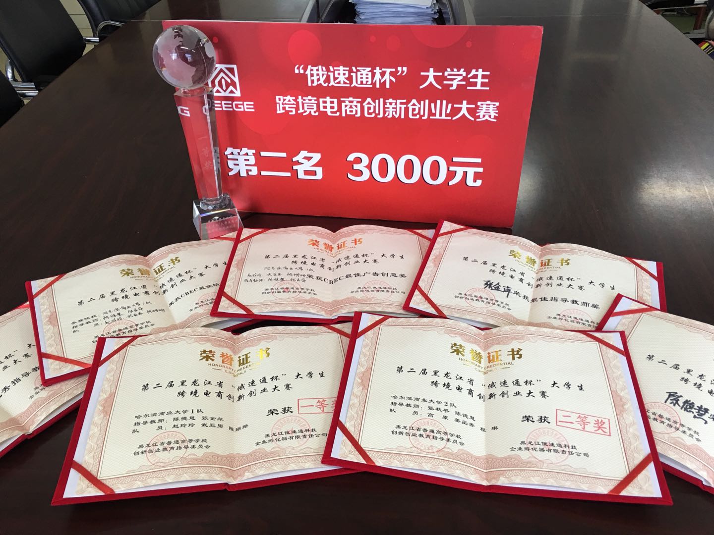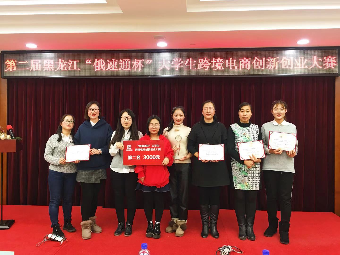 在经济学院领导的大力支持下,我校经济学院国际经济与贸易专业师生经过近两个月的精心准备和刻苦训练以及决赛全天的鏖战,由陈德慧副教授和张金萍教授指导、由国际商务专业硕士2017级的赵玲玲、2018级的武亚男和国际经济与贸易(对俄经贸方向)本科2015级的陈珊珊同学组成的哈尔滨商业大学1队总成绩位列第2名,荣获团队一等奖和3000元现金奖励,并获得“CBEC最佳广告创意奖”和“CBEC最佳销售团队奖”两项单项奖。陈德慧和张金萍两位老师获得“最佳指导教师”称号,并被俄速通科技企业孵化器聘为“CBEC跨境电商产教融合讲师”。由张秋平副教授和陈德慧副教授指导、由国际商务专业硕士2017级的高原和国际经济与贸易本科2015级的姜函秀和本科2016级的程琳同学组成的哈尔滨商业大学2队总成绩位列第14名,荣获二等奖,两位指导老师获得“优秀指导教师”称号。