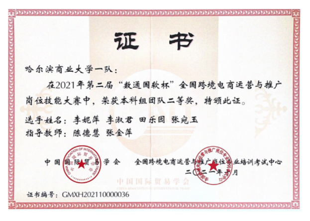 在经济学院党委书记蒋孝洪、经济学院院长韩平等学院领导的大力支持下,国际经济与贸易专业10余位师生历经1个多月的刻苦训练,决赛当天两队参赛选手配合默契,经过3个小时的激烈角逐,由学生李妮萍、李淑君、田乐园和张宛玉学生组成的哈尔滨商业大学1队和学生李明亮、杨再明、刘欣晨和牛真真组成的哈尔滨商业大学2队均荣获团体二等奖。陈德慧、张金萍和杨慧瀛三位教师荣获“优秀指导教师”奖。
