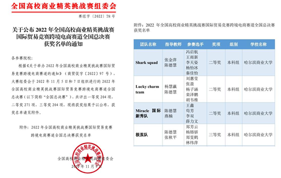 11月5日、7日,2022年全国高校商业精英挑战赛国际贸易竞赛跨境电商赛道全国总决赛在线上举行,我校经济学院国际经济与贸易专业共有四支代表队18名同学经过知识赛、省赛层层选拔,成功入围全国总决赛,与全国300多所高校的600多支参赛队伍同台竞赛,经过两日的鏖战,最终斩获二等奖3项、三等奖1项,展示出了经济学子敢于实践、拼搏进取的精神风貌。