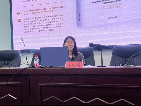 讲座中,徐晓明研究员以“发展模式-高质量发展、核心动力-新质生产力、制度体系-体制机制改革”为主线进行讲解,尤其在“关键动力——新质生产力”部分,徐晓明研究院深入浅出地回答了“为什么”—新质生产力的提出背景、“新在哪”—新质生产力的理论贡献、“做什么”—新质生产力的发展体系,为全院师生全景剖析了因地制宜发展新质生产力的理论脉络。