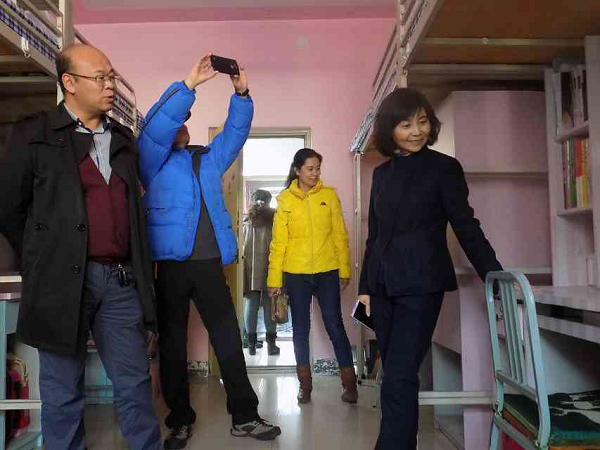 在学院舍管中心的同学们热情带领下,领导们来到了公寓的5、6楼——16级学生女生寝室的所在地。一开始,干净明亮的走廊就让领导们和在场的学生干事们都感到心情愉悦,走进学生寝室:整齐划一的壁纸贴满了墙面、桌面,显得温馨又美好;生活用品、学习用品被有条有序地摆放;寝室地面干净明亮……有的寝室甚至铺了地毯、挂了气球。从种种细节可见,16级新生对此次活动的重视程度。2016级辅导员孟宪弢老师更是时时拿起手机忍不住拍照,用行动为孩子们的努力成果点赞!虽然11公寓是男生公寓,男生对寝室的装扮也不及女生用心,但是它们的整齐干净、明亮大气还是得到了大家的表扬!
