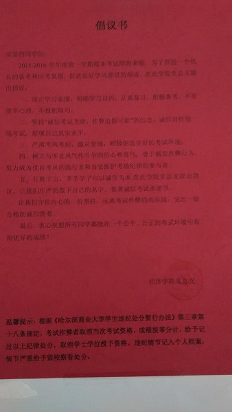 首先,我院各年级辅导员分头召开了年级学生干部及各班级考风考纪教育大会,号召全体学生要诚信考试,杜绝作弊现象,同时向全体学生传达了《学生手册》中关于考试违纪作弊的处分条例,以及国家有关替考列入刑法的有关规定。其次,在学院办公区及学生公寓楼下张贴《诚信考试倡议书》。各年级各班分别签诚信订考试承诺书。学生们承诺营造优良的备考和应考氛围,端正学习态度,严格遵守学校校规校纪。再次,我院还在院团委微信公众号上发布了诚信考试的倡议,利用新媒体手段宣传“诚信考试光荣,作弊造假可耻”的信念,希望全体学生成为优良学风考风的践行者和自觉维护考场纪律的参与者。