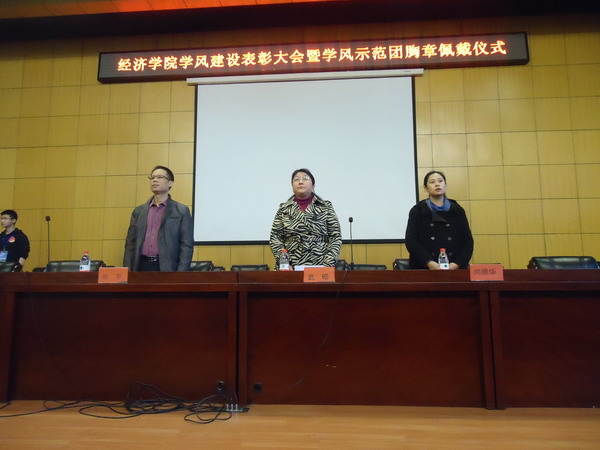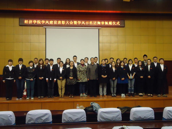 优良的学风是激励学生奋发向上、努力成才的精神力量,为了促进经济学院学风建设的全面深入开展,鼓励广大学生勤奋学习、积极进取,4月16日下午我院特举办了经济学院学风建设表彰大会暨学风示范团胸章佩戴仪式。出席本次大会的有:经济学院党总支书记韩平教授,党总支副书记武皓老师,团委书记兼11级辅导员沙靖宇老师,团委副书记兼10级辅导员尚振华老师以及11级12级优秀学生干部和13级全体同学。会议由沙靖宇老师主持。