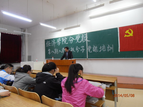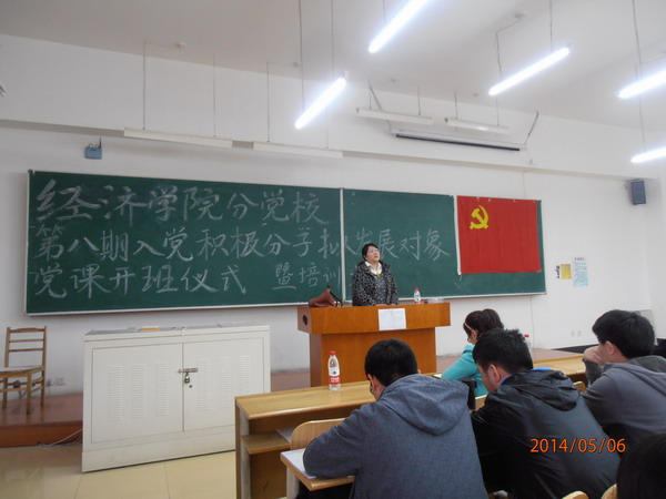 经济学院于2014年5月5日在4207召开分党校第八期党课开班仪式,我院党总支副书记武皓老师、副处级辅导员孟宪弢老师、团委书记沙靖宇老师以及此次党课培训全体成员参加了开班仪式。