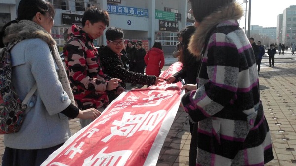 签名活动由经济学院团委青年志愿者部主办,活动一开始就吸引了很多同学的注意,展台的正中央是一幅巨大的宣传漫画:漫画的主要内容是一位老师正在给学生上课,老师在讲台上督促学生认真听讲,而学生却在课桌下偷偷地玩着手机,形象生动地体现了如今部分大学生上课时的状态。漫画的右侧写着“放下手机,把时间留给智慧;放下手机,让青春拥抱春天;放下手机,用行动播撒爱心”宣传标语。倡议的同学们更是举着印有“莫让手机劳心神,修身立学为最真”几个大字的横幅向过往的同学们宣传,同学们纷纷上前响应此次倡议活动,并在横幅上签名做出承诺,场面十分热烈。经济学院青马学风示范团全体成员在条幅上签名郑重承诺,在课堂上不玩手机。短短的两个小时里,红色的横幅上满是名字,这是同学们积极响应的凭证。
