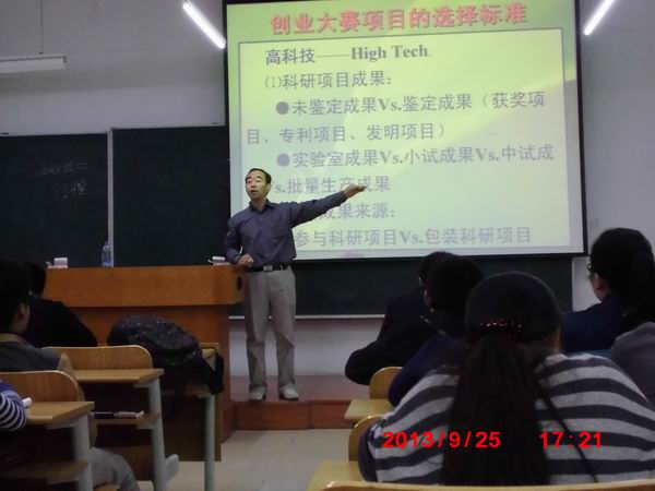 之后,马兴胜教授正式作报告。马教授首先提出“凭什么在就业岗位具有竞争力”这个问题,吸引了同学们跟着他的思路走下去。他指出,创新创业的宗旨是崇尚学术,追求真知,勤奋学习,锐意创新;重点是循序渐进地完成创业计划。确定好人员分工,并做好文献搜索工作,之后正式参赛。随后他从前期准备、项目选题、实施思路、研究内容、项目审评这五个方面介绍了“挑战杯”创新创业计划的实施步骤,并以技巧方法结合典型案例的形式进行了详细解说。马教授语言诙谐幽默,通俗易懂,同学们兴致勃勃。他强调,课题最好以应用型为主,切实反映当下的一些现实问题,符合社会的需求导向。最后,马教授还为同学们介绍了创业项目申请的一些细节问题。马教授用简明的话语、清晰地脉络为同学们解答了疑惑,大家从中收获颇丰。