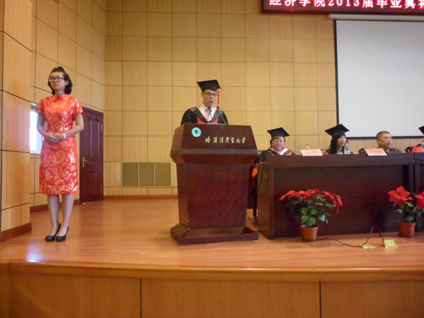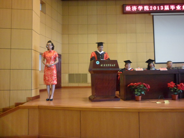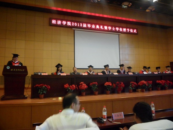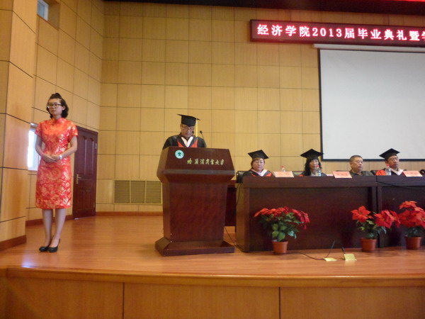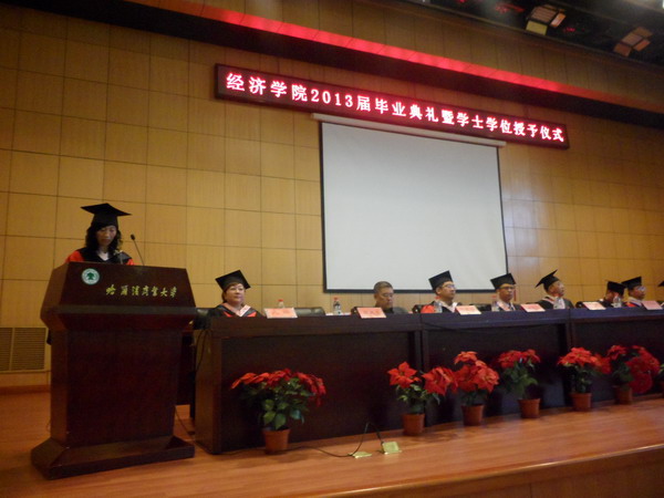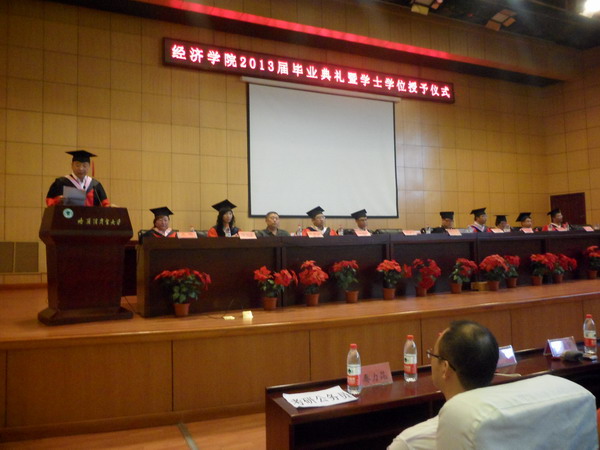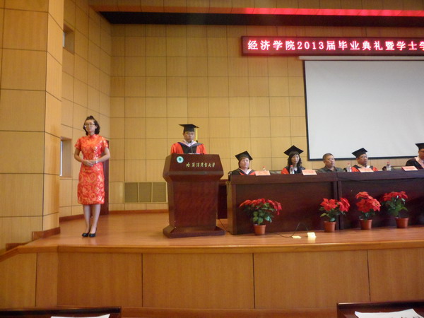6月18日上午,2013届毕业典礼暨学士学位授予仪式在专家公寓隆重举行,经济学院院长项义军、党总支书记韩平、副院长王涛、孙波、郝大江、西方经济学教研室主任张英、经济学教研室副主任宋德军、国际经济与贸易教研室主任胡元礼、统计学教研室主任张恩英、政治经济学教研室主任张型双、辅导员孟宪弢、沙靖宇、尚振华、 秦力昆、2013届全体毕业生及院团委办公室学生会代表出席了本次毕业典礼,大会由党总支副书记武皓主持。