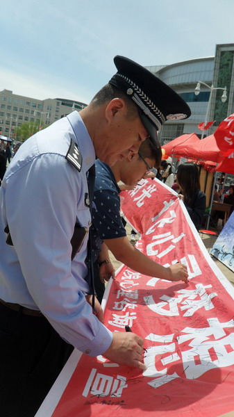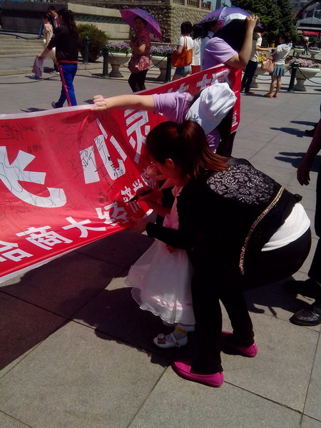 “条幅签字”:学生们热情,有礼貌地向周围的市民和游客讲解本次活动内容和意义,并且宣传心理健康知识,市民和游客纷纷用签字笔留下他们的名字,在红色条幅上密密麻麻的签字代表着每一份关注大学生心理健康的力量。