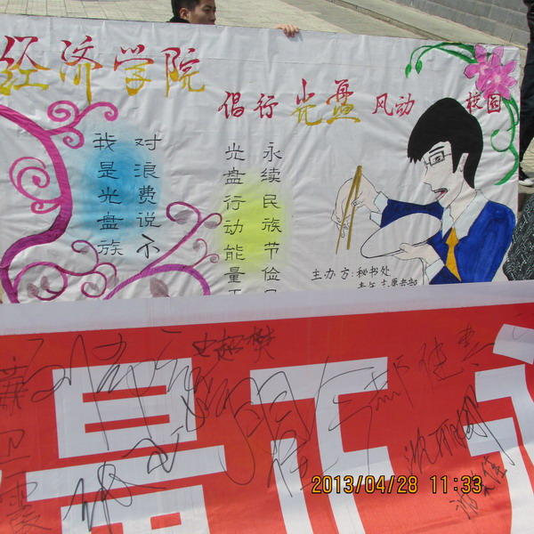 为了认真贯彻落实党的十八大精神,响应学校学工部、校团委厉行节约、反对浪费教育活动的要求,2013年4月28日,经济学院以“光盘行动能量正,永续民族节俭风”为主题的“光盘”行动宣传教育活动在A区食堂门口隆重举行。此次活动在经济学院领导老师的指导下,由经济学院团委秘书处和青年志愿服务部主办,借此倡导同学们传承节俭美德,从“光盘”做起。