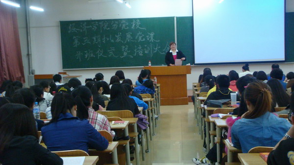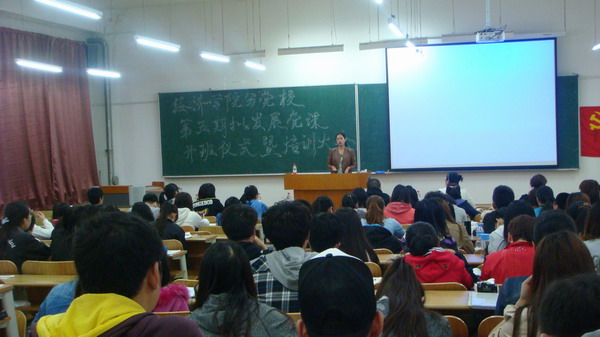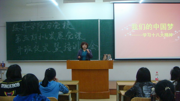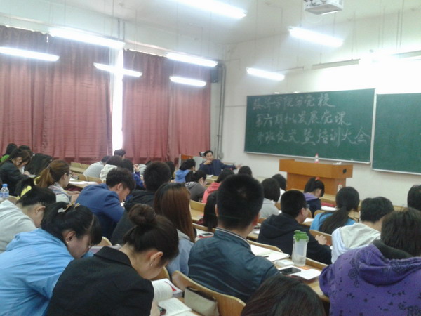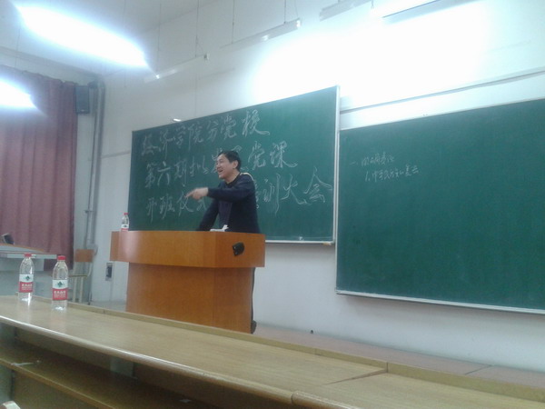 党总支副书记武皓书记首先讲话,她从在座学员是青年马克思主义者的先进性代表说起,对全体学员提出要求,她说,分党校是对入党积极分子进行党的基础知识培训,是发展党员的必经程序和必要条件。党课作为在大学生中发展党员工作的关键环节,不仅是实现组织入党和思想入党相统一的重要手段,也是入党积极分子成长为光荣的共产党员必不可少的过程,更是确保发展新党员质量的基本要求。本次党校培训,我们邀请到我们学校马克思主义学院四位优秀教授,大家要珍惜这次学习机会,把学习党章、遵守党章、贯彻党章、维护党章变为自觉意识和行动,紧紧把握党的先进性建设这个核心,着力提高在座全体学员的政治觉悟和理论水平。要深入系统地学习,做到对党的性质、指导思想、最终目标、根本宗旨及党的基本理论、基本路线、基本纲领和基本经验有较深刻的认识,进一步增强共产主义信念,树立马克思主义世界观,自觉地为党的纲领和路线而奋斗。作为同龄人中的佼佼者,应该不断提高思想政治素质,把党章中的条例变为思想中自觉的感悟,坚定跟党走中国特色社会主义道路的理想信念,争做学生和时代的楷模。随后,尚振华老师详细讲解了发展党员的程序要求和本期党课学习计划和时间安排;并鼓励同学们积极为入党做准备。开班仪式后,马克思主义学院的老师们为积极分子和拟发展对象做了精彩的授课。
