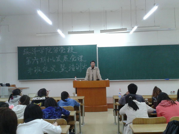 2013年5月12日星期日,经济学院第六期分党校开班仪式暨培训大会隆重召开。经济学院党总支副书记武皓,副处级辅导员孟宪弢、团委副书记沙靖宇、2010级辅导员尚振华、兼职辅导员秦力昆以及此次党课培训全体成员参加了开班仪式。