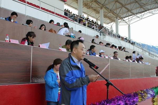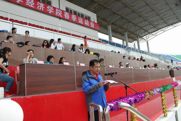伴着铿锵有力的运动会进行曲,国旗班、经济学院党支部、团委办公室、学生会组成的方阵和各年级各专业方阵的同学们迈着矫健整齐的步伐进入会场。在庄严的升国旗仪式后,院长项义军教授致运动会开幕词,项院长充满诗意的说:“初夏犹清和,芳草亦未歇。五月的商大校园,花草旖旎。在这生机勃发的季节,经济学院在此召开2013年春季田径运动会。今天我们将一道:点燃激情,放飞梦想;迸发活力,挥洒青春;享受运动,吟咏健康!”项院长在开幕词中对全院师生阐述了运动的意义,他说:“体育是力量的角逐,也是智慧的较量。对于体育,我们这个国家、民族,甚至整个世界,无人小窥。体育不只锻炼意志,增强体魄,更能愉悦身心,塑造品格。毛泽东主席曾经说过:‘体育载知识之车,而寓道德之舍也’”在进一步诠释了奥林匹克精神后,项院长对全院师生寄予了殷切的期望,他希望全体运动员发扬“更快、更高、更强”的奥林匹克精神,文明参赛、规范参赛,以饱满的精神风貌,坚韧不拔的意志,凝聚学院精神,比出水平、赛出风格,切实践行“商雅兼备、经世济民”的院训。最后,他说:“让我们戮力同心,脚踏实地,把本次运动会办成文明、简约、热烈、庄重的大会,为全面提升学院的办学水平,推动学院各项工作的开展做出应有的贡献!” 院长致开幕词后,运动员代表李佳丽同学和裁判员代表闫继尧庄严宣誓。